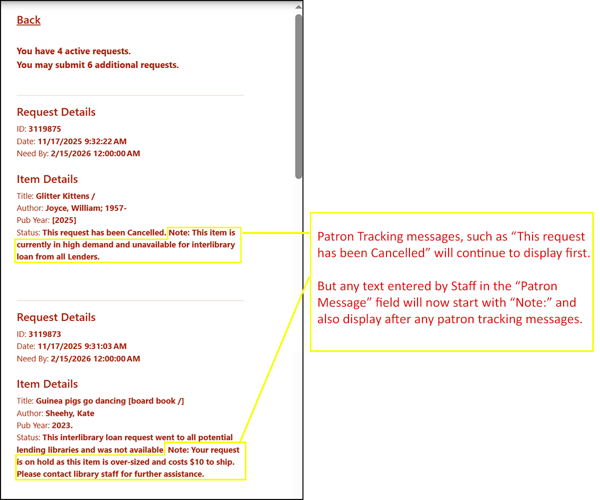 - Patron Tracking Messages: Update your custom patron tracking messages to inform patrons of service slowdowns when they login to view an update on their ILLs. We recommend updating notices related to Awaiting Approval, Pending and any frequently used messages prior to the "Shipped" message. Contact us for assistance or suggestions!