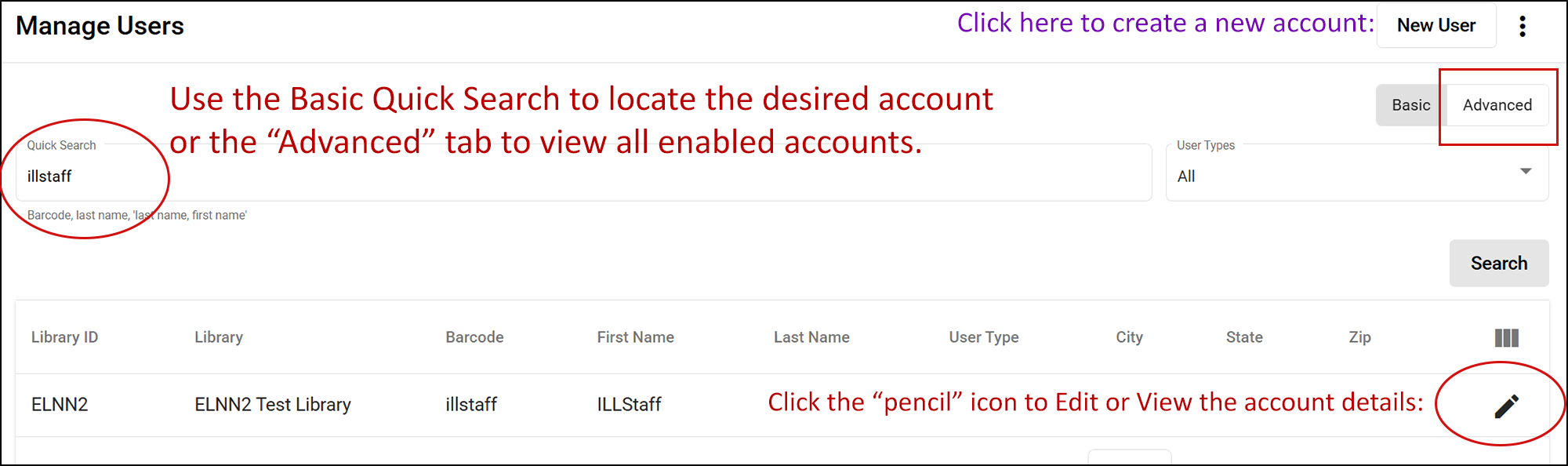- Editing Passwords: Under "Manage Users" use the quick search to locate the desired account name and click the "pencil" edit icon. After clicking the Edit icon, update the fields *Password and *Confirm Password and click Save to submit your changes.