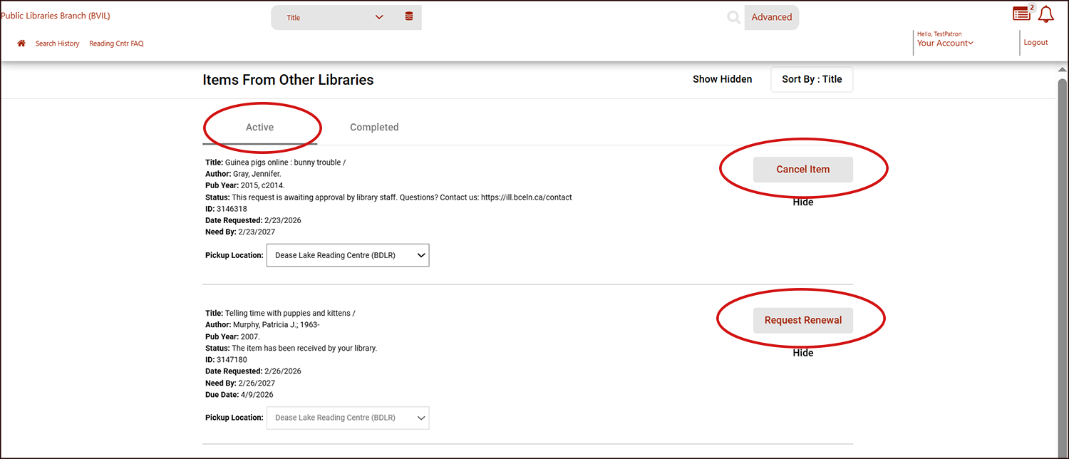 - Request Renewal: Under your Active tab, the option to request a Renewal will also be active if available. Please note that many Lenders do NOT allow renewals of their items and we may need to manually contact them via email to make the request.
