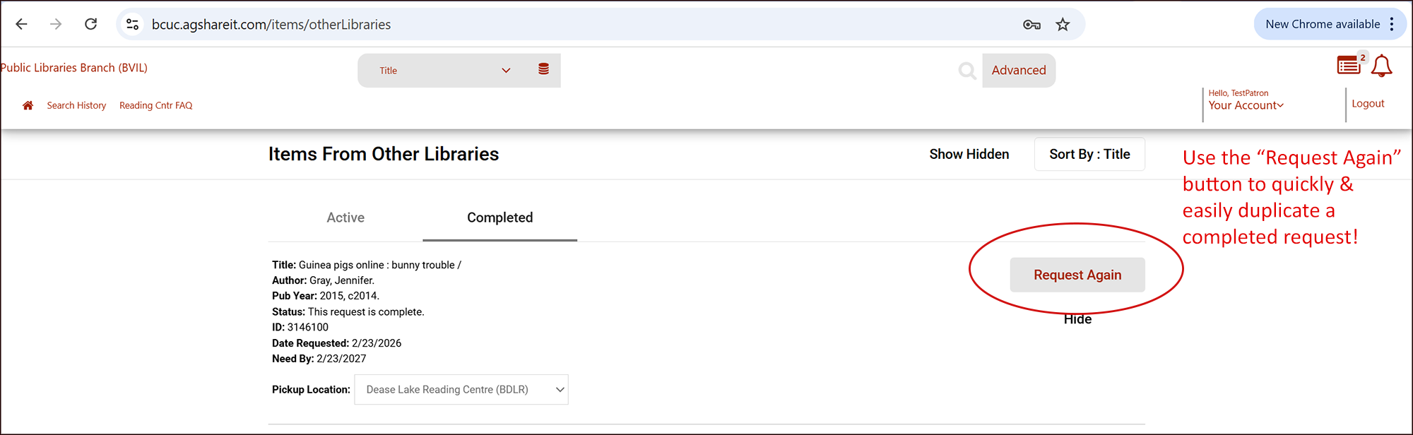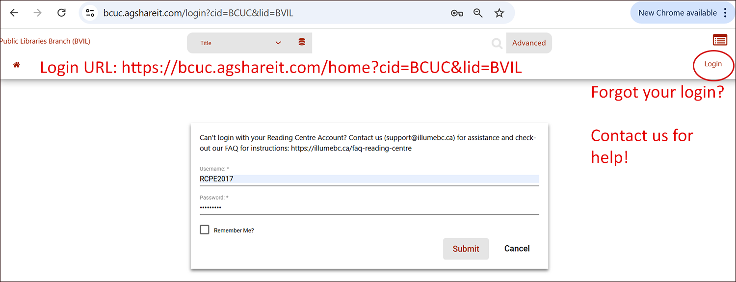 [ILL Requests] As of October 2017, Reading Centres can now submit their requests to the Public Libraries Branch (BVIL) as logged in patrons. This allows more account permissions than the previous guest requesting method - such as cancelling requests, requesting renewals, duplicating requests, and updating passwords! Guest requesting is no longer available and please contact us if you are no longer able to login.