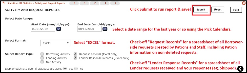 • Statistics on Expired or Complete Requests - If you are extending your temporary closure or you will be unable to update Expired requests soon, we also recommend you run two reports from your Staff Dashboard > Statistics > ILL Statistics > Activity and Request Reports report section. Check-off both the Request Records (Excel only) and Lender Response Records (Excel only) reports for the past year and choose "Excel" format then Submit to run (long reports may take a few minutes to generate). These spreadsheets contain a Borrower & Lender list of past Complete & Expired requests, including available Patron data (patron info is deleted when a request is automaticallly deleted by the system). This backup of requests will assist Staff in re-creating requests or following up with other libraries where necessary!