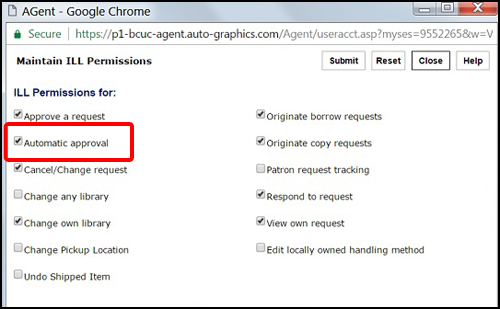 Check the User Account Setup [PDF] document for information on how to edit your user account or contact us for assistance turning off Automatic approval. Locate your accounts under Staff Dashboard > User Admin tab > Edit User Accounts > Submit to see the entire user list. Click on the user account you'd like to edit then choose the ILL Staff - ILL Permissions link to display and edit the Automatic approval option.