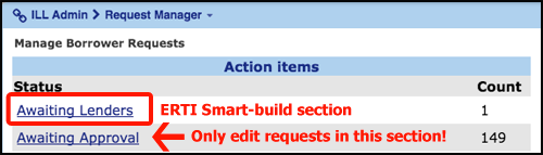 With Automatic approval deactivated the requests will first enter Awaiting Lenders (to ERTI smart-build the lender list - please don't edit requests at this stage!) and then are sent to Awaiting Approval. At the Awaiting Approval stage within your Request Manager, you are able to manually add, edit or delete lenders and then submit the request via "Approved - Send". If there are no lenders listed you will be able to see this at the Awaiting Approval stage.