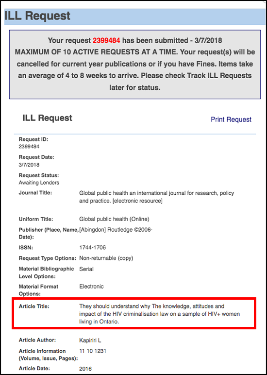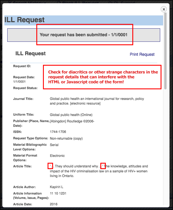 - Article Title Example: If you tried to submit a request for the Article Title ' … They should understand why … ' The knowledge, attitudes and impact of the HIV criminalisation law on a sample of HIV+ women living in Ontario. (example in the screenshot above) the request would fail since the apostrophes ' in the Title can sometimes interfere with the javascript of the request form.