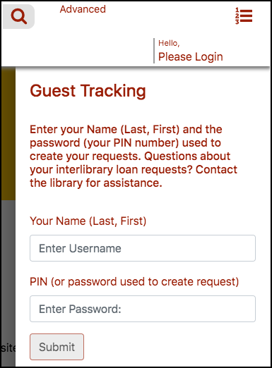 [Patron-Initiated Interlibrary Loans] When guest patron tracking is activated status messages display for each request when a patron logs into their "Guest ILL Tracking" located in the top right-hand corner by clicking the   icon. Both the login message and the status messages can be customised for your library.
