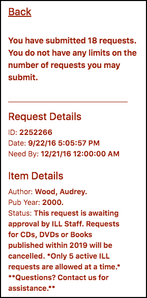 March 2020: Auto-Graphics has resolved all issues with the Guest ILL Request Limits feature. Combine guest request limits with the new highly requested Borrowing Policy feature that allows libraries to block the "Request this Item" button on formats (such as CDs or DVDs) that you don't wish patrons to request!