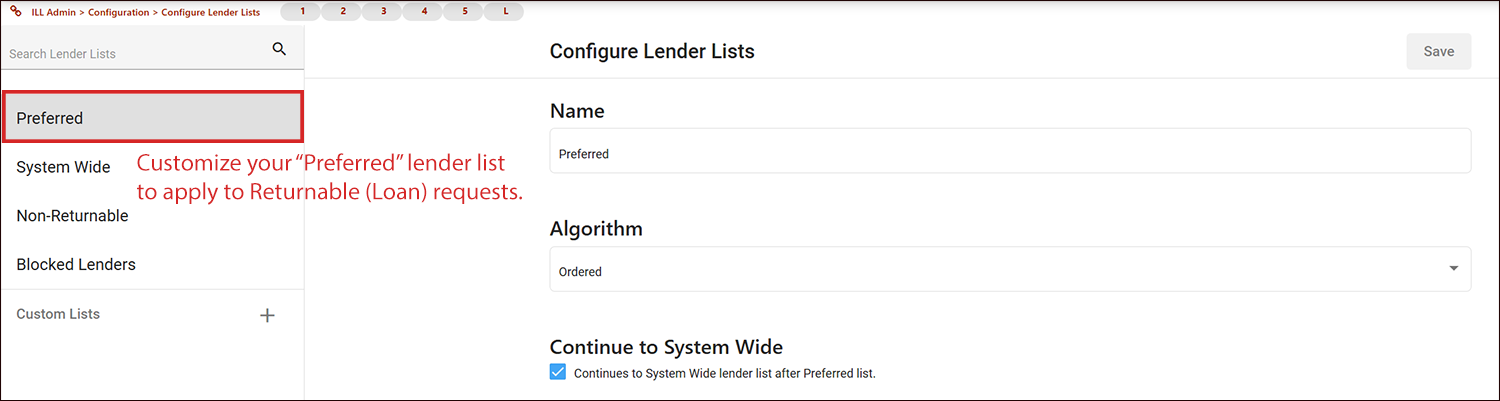 • Returnable (Loan) Requests: For Post-secondary institutions, Loan requests use the "Preferred" lender list available under Staff Dashboard > ILL Admin > Configuration > Configure Lender Lists. This currently defaults to the same order as the Non-Returnable lender list unless your library has customized your lender list configuration.
