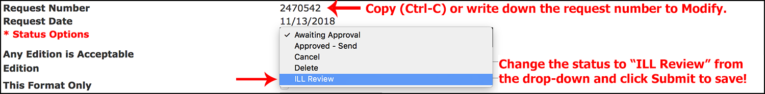 1. When logged in (may need Administrator access), locate the request you wish to modify and copy (Ctrl-C) or write down the request number. Then change the status of the request to "ILL Review" and click Submit to save your changes.