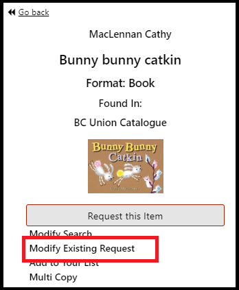 3. Once you've located the Full Details of the new record you'd like to assign to the request, ILL Staff can click the "Modify Existing Request" link under Staff Options.