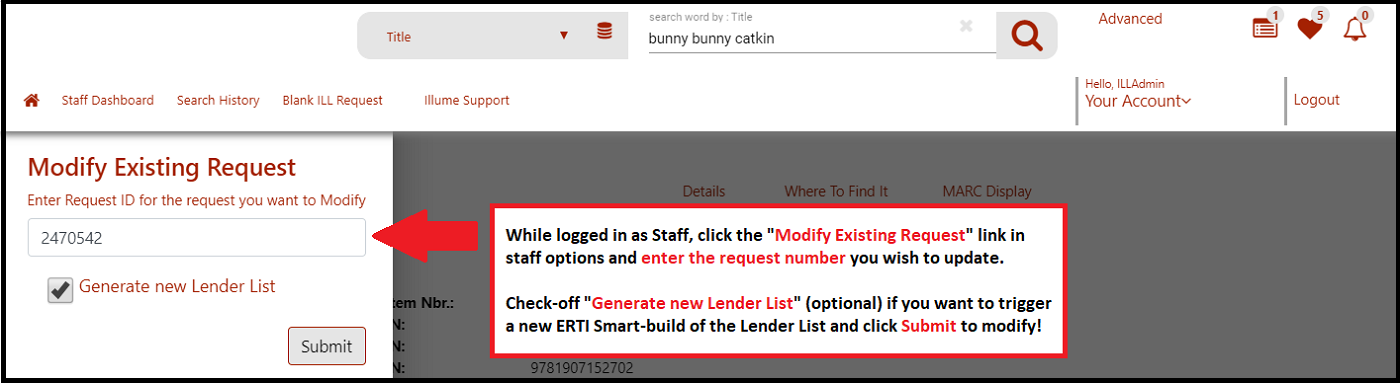 • Old Requests: If you have a request that was created months ago and you'd like to refresh the ERTI Smart-build automatic lender list build; you can send the request to ILL Review and choose the same or a different record. Check-off the "Generate new lender List" option when using the Modify Existing Request button to automatically re-build your lender list.
