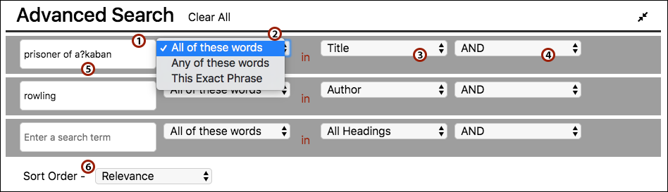 - Wildcards include question marks ? for single character wildcards (can be used multiple times in one term) and asterisk * for mutliple characters. Wildcards can be used in both Simple or Advanced Searches.