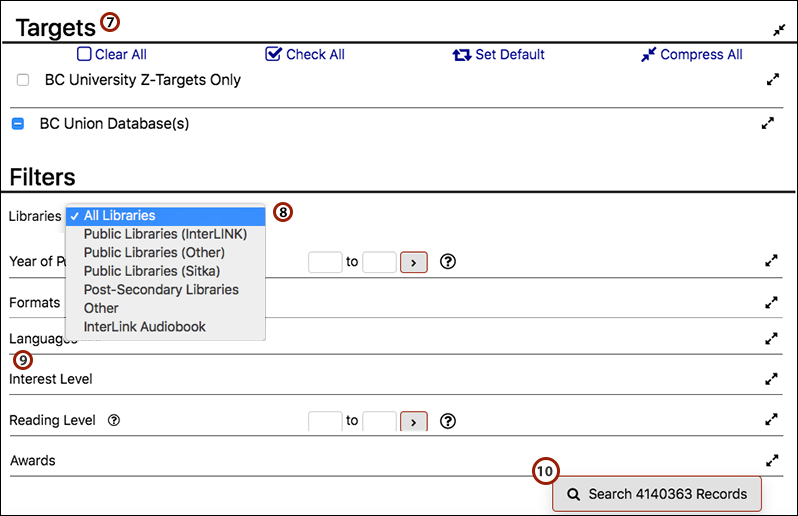 - The number of total searchable records for our BC Union catalogue union database is displayed at the bottom of the Advanced Search. These record numbers will update as you select different Filters (eg. Language). This record count does not include records in live Z39.50 targets only (eg. University of BC).